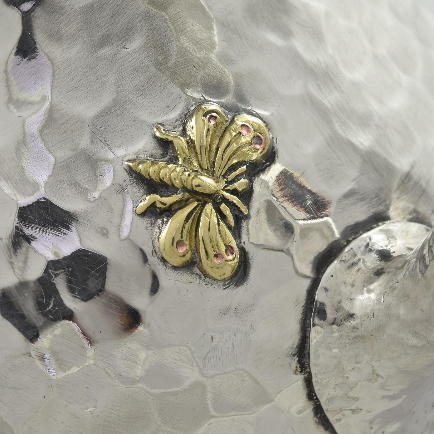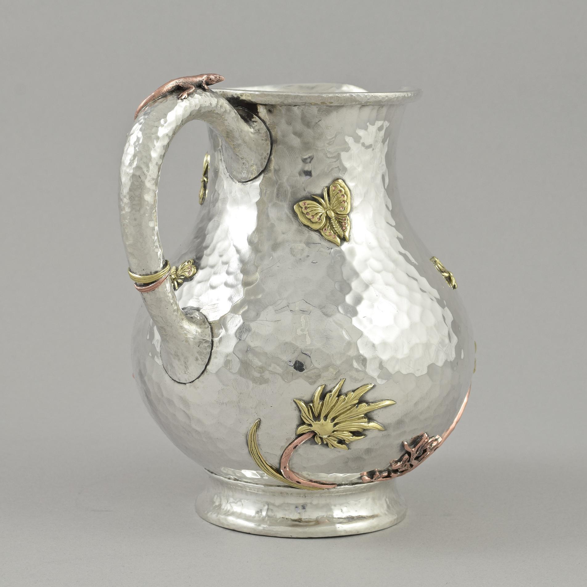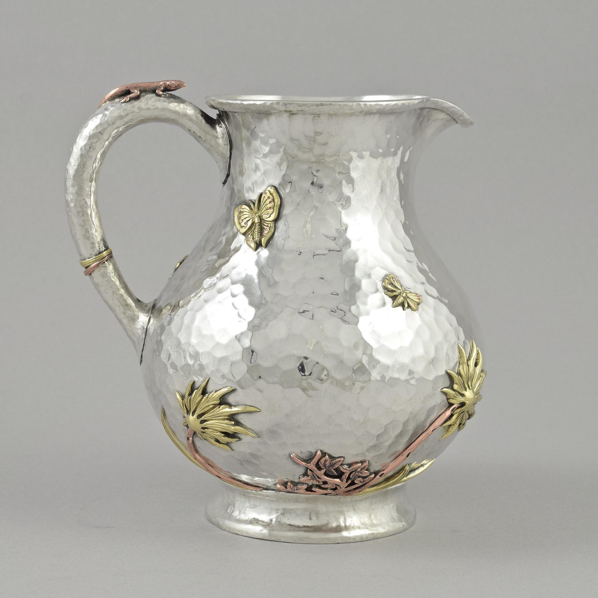 Circa 1880 in the Aesthetic 'japanesque' style, applied with mixed metal flowers, foliage, butterflies, insects, a bird and lizard.