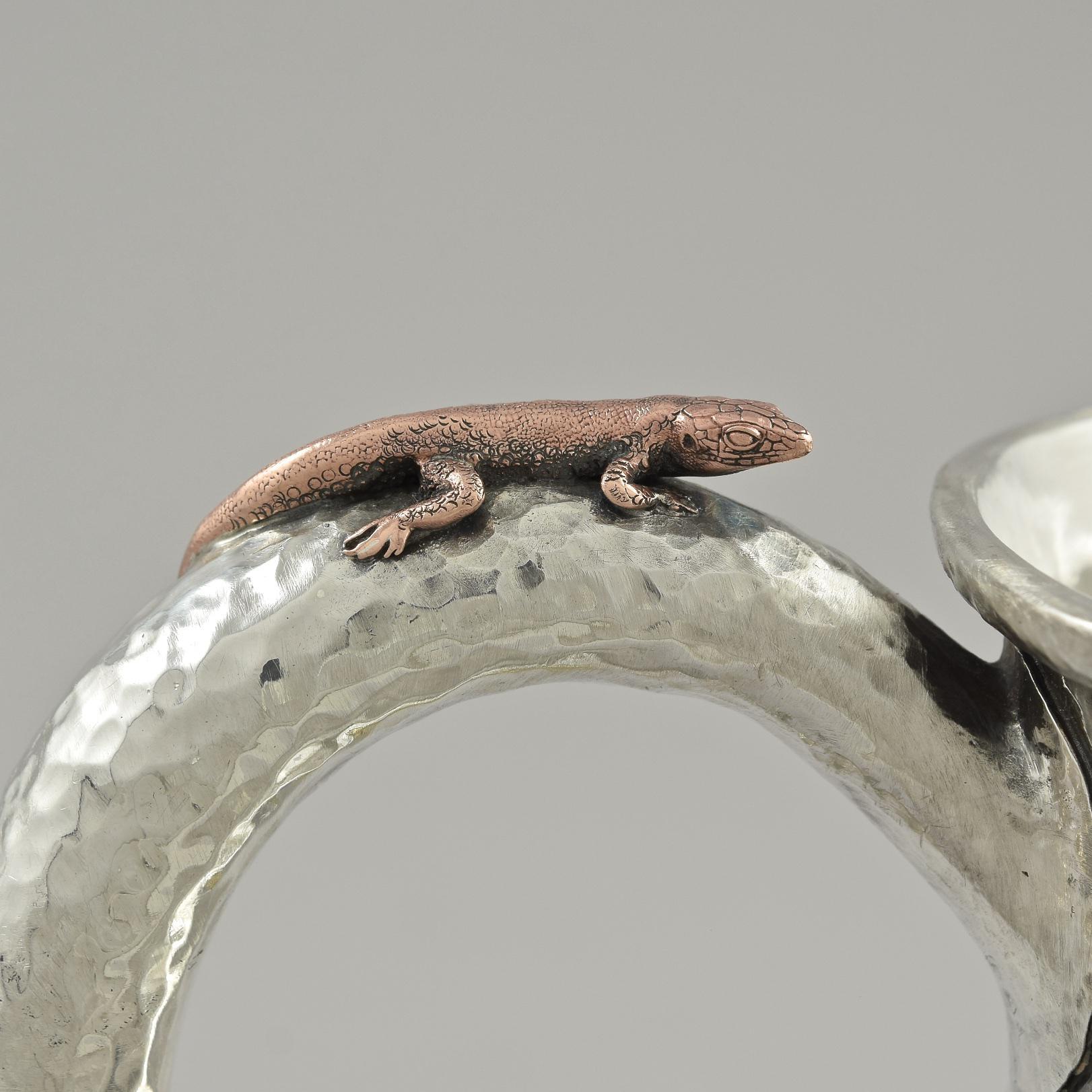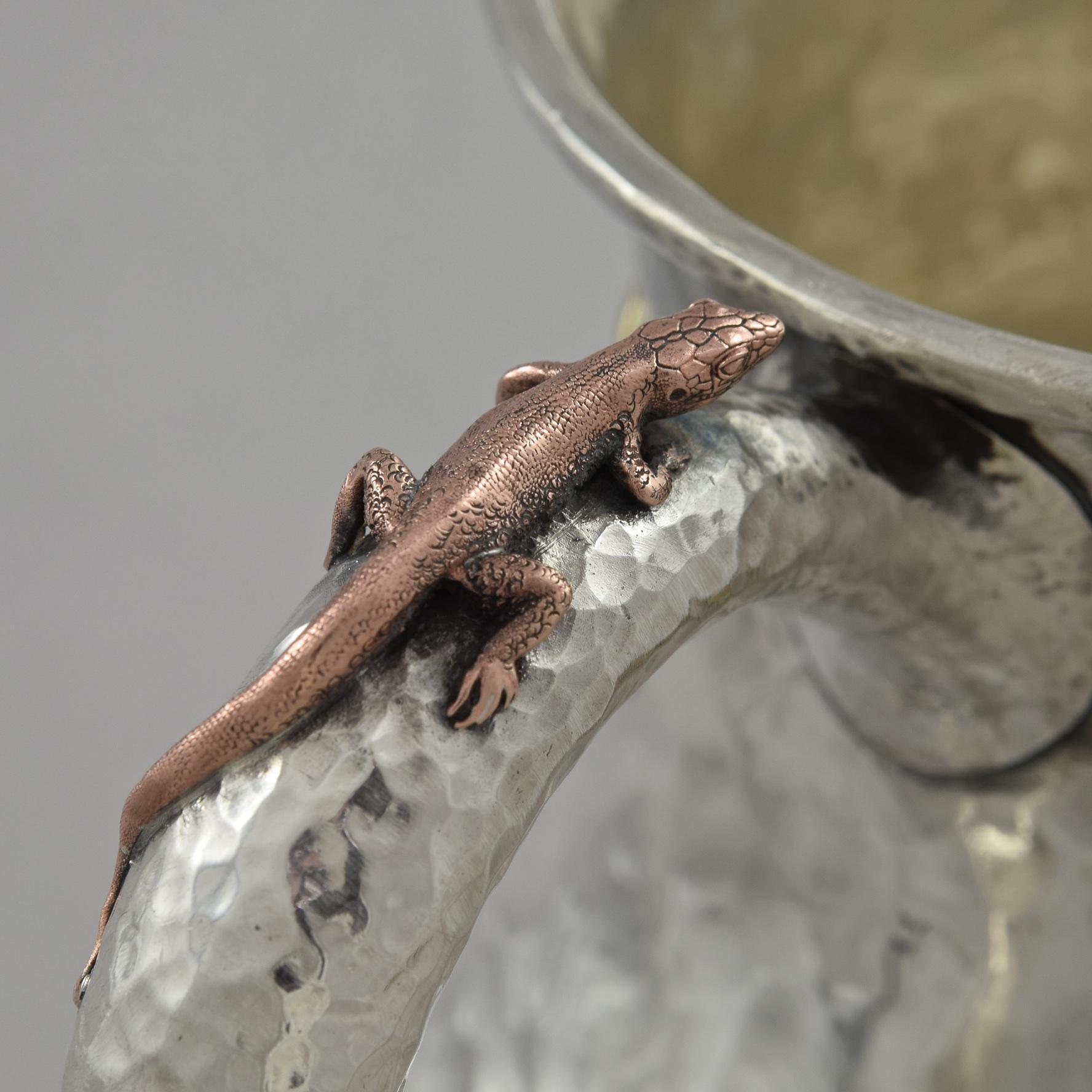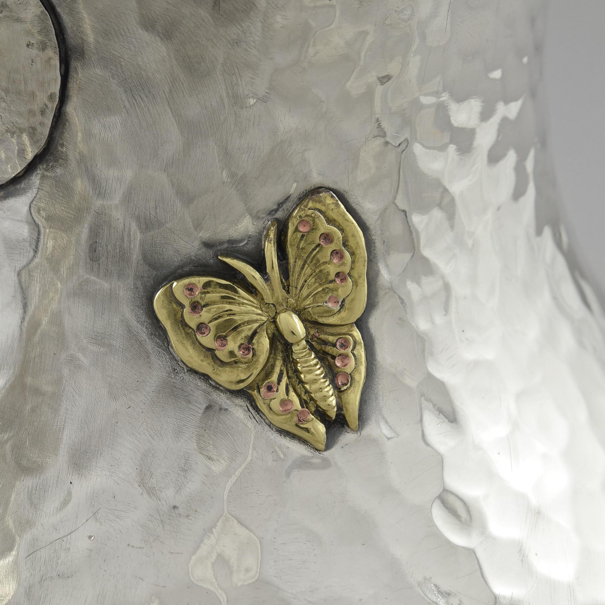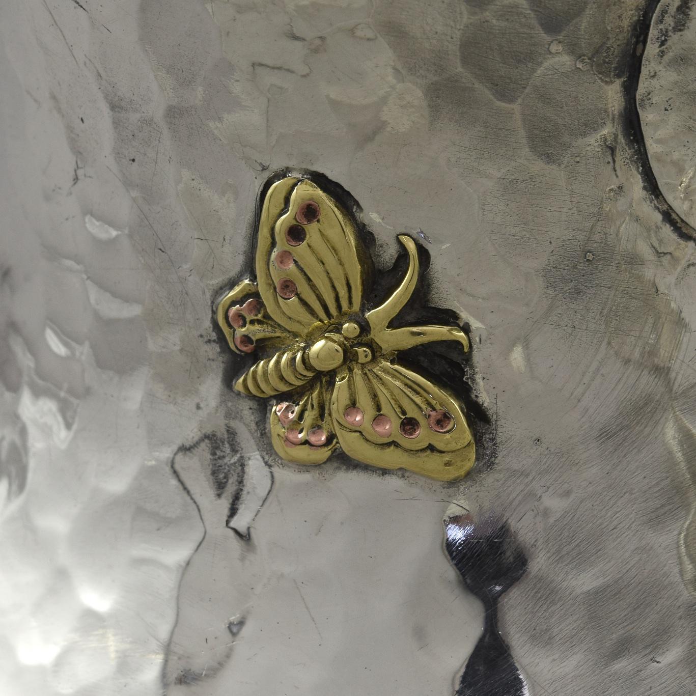 Circa 1880 in the Aesthetic 'japanesque' style, applied with mixed metal flowers, foliage, butterflies, insects, a bird and lizard.
