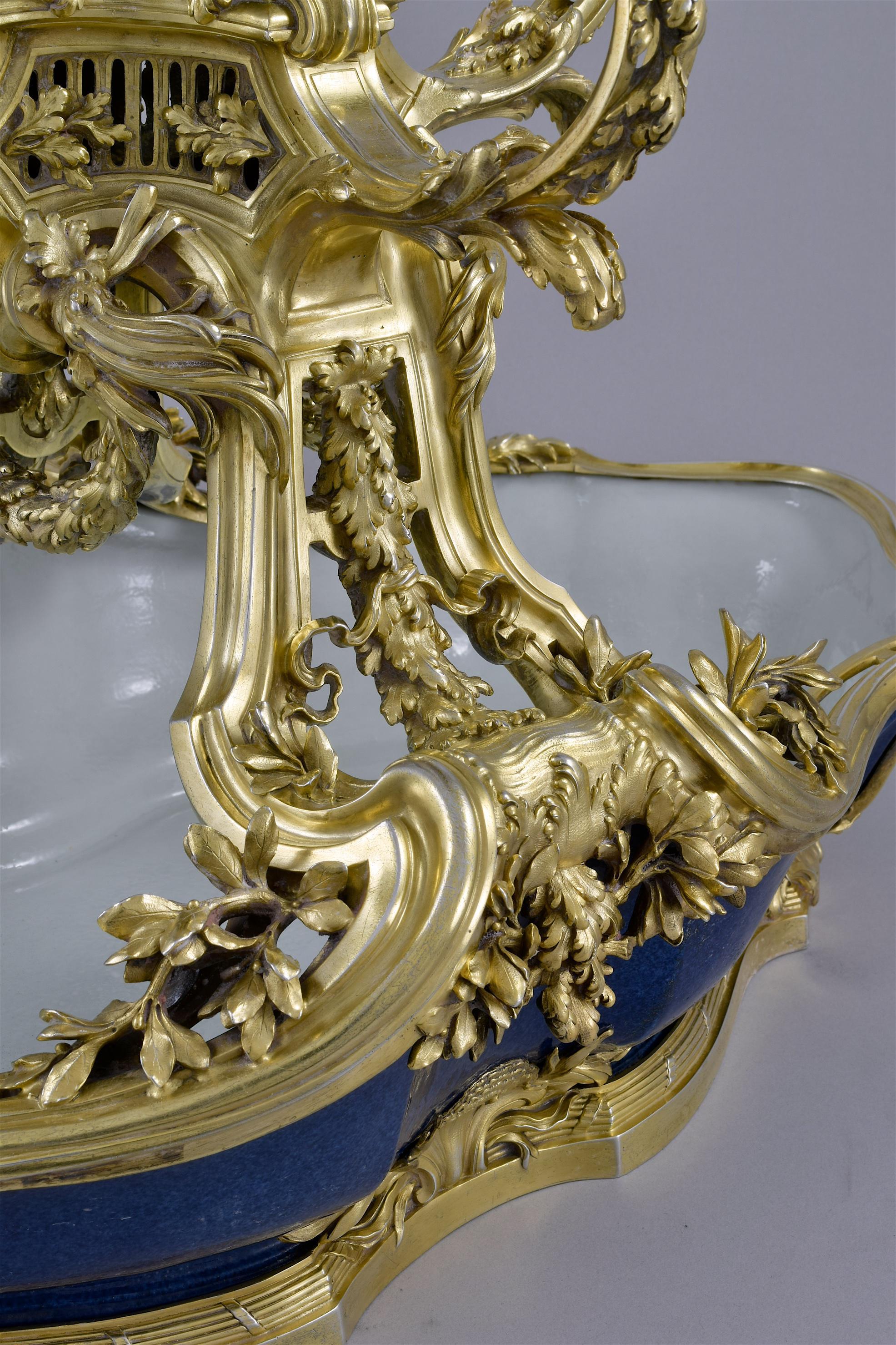 A magnificent French silver-gilt and blue-porcelain candelabrum centrepiece