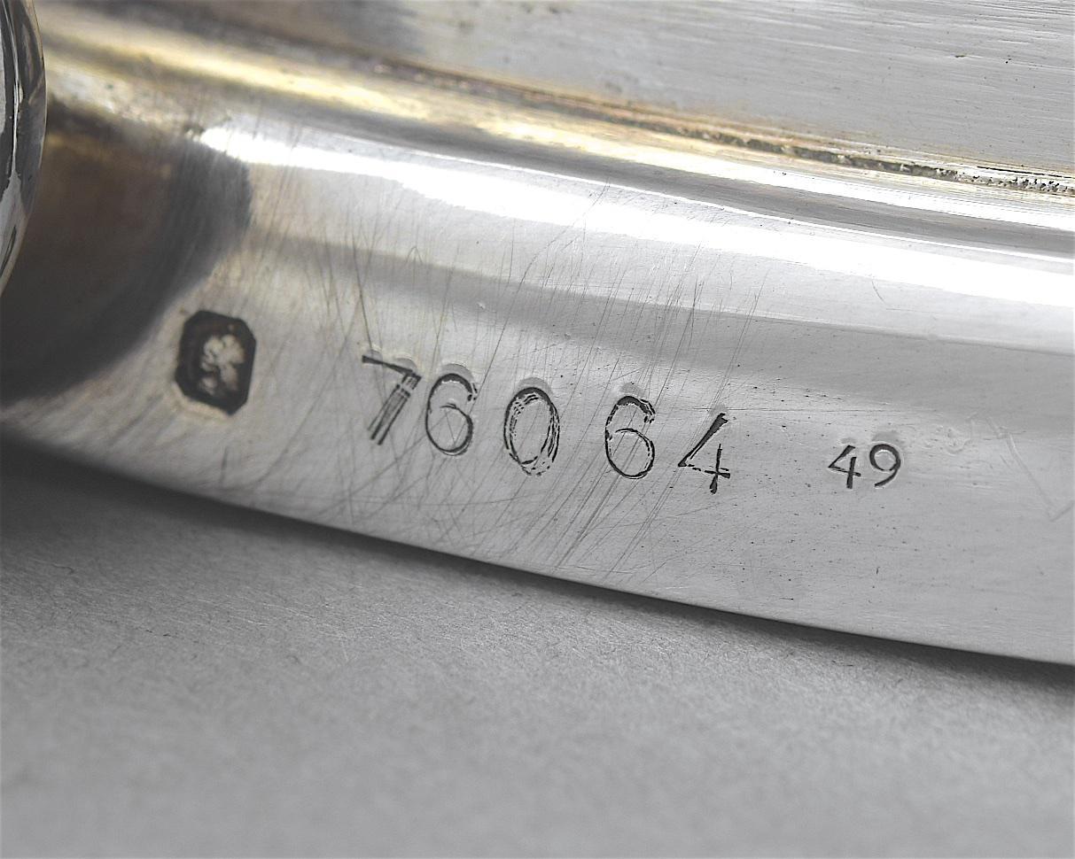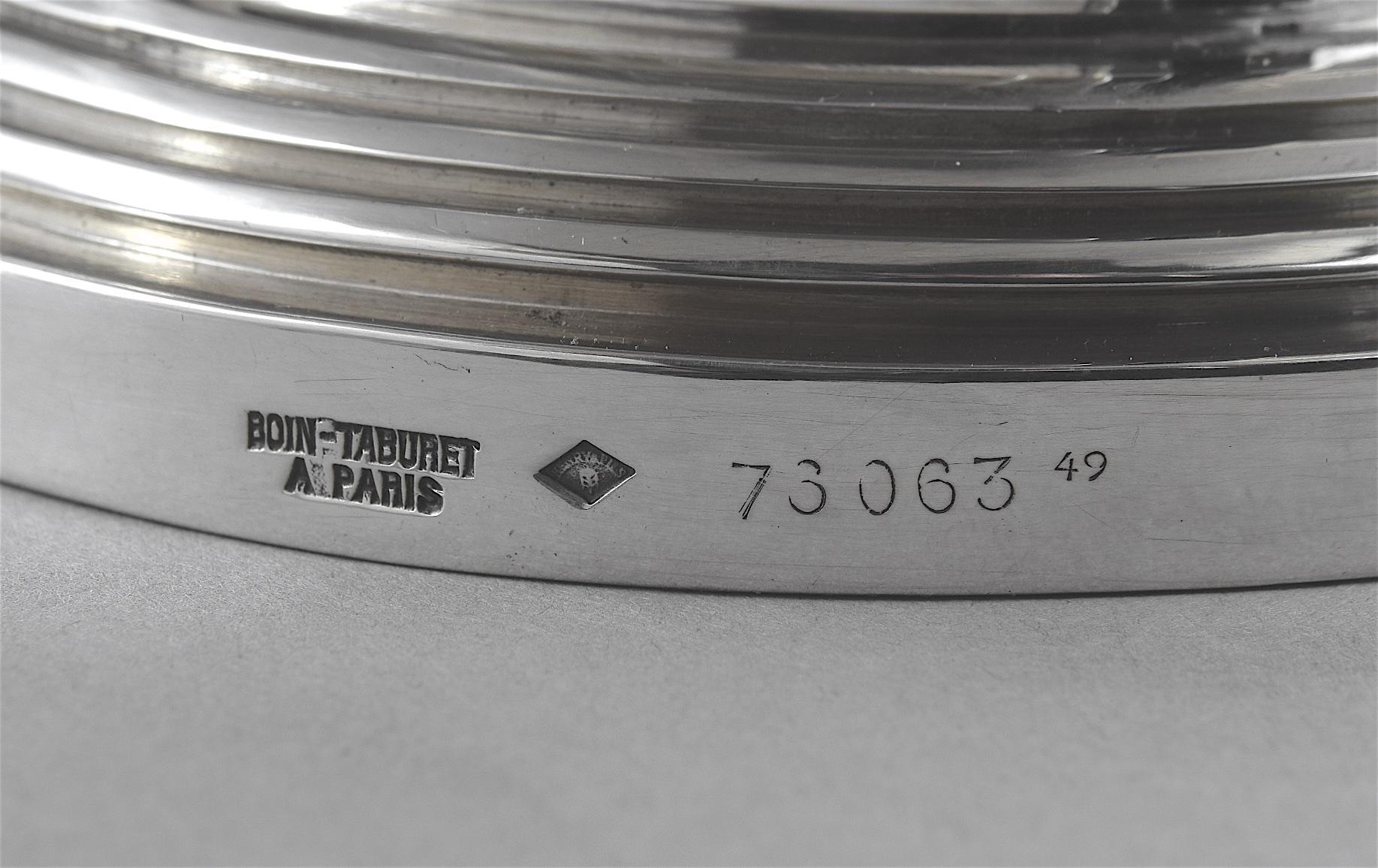 The tureen stamped 'BOIN-TABURET A PARIS' and numbered '78063' and engraved '11 juillet 1935 C.S.-A.G. 11 juillet 1960', the tray numbered '76064', and the lid numbered '76063', with French first standard silver marks.