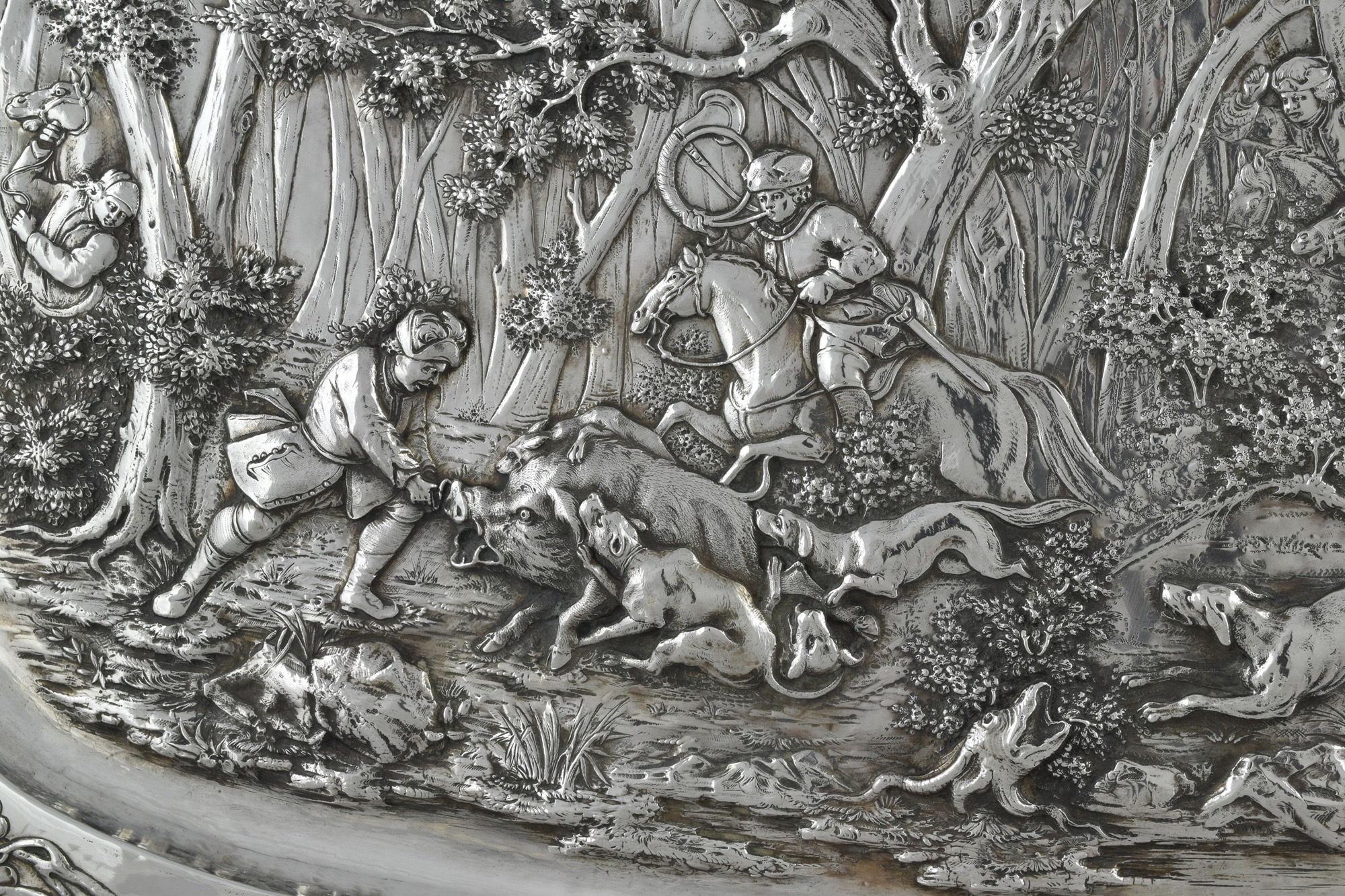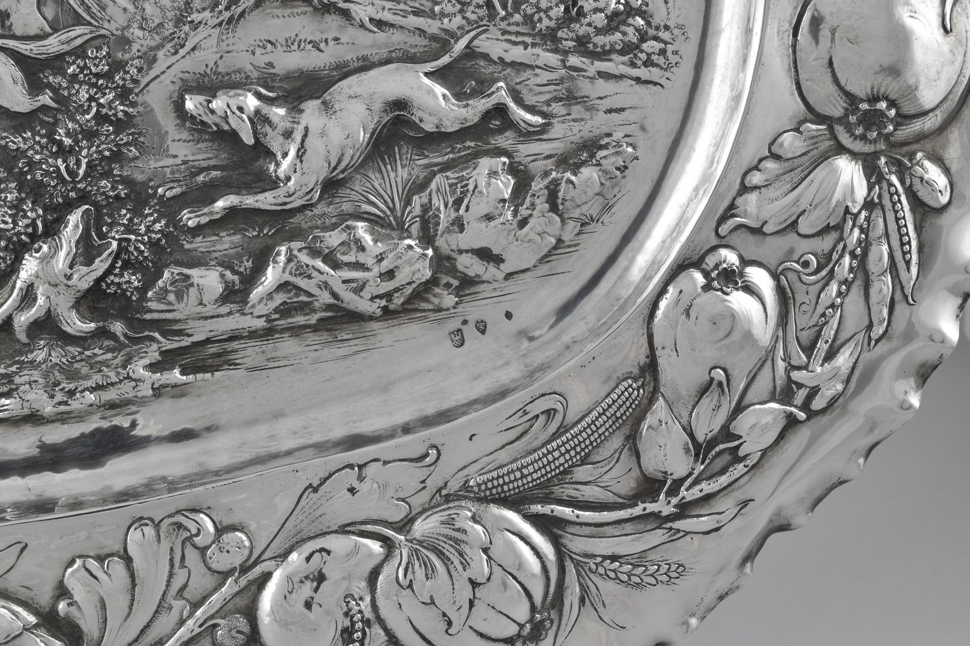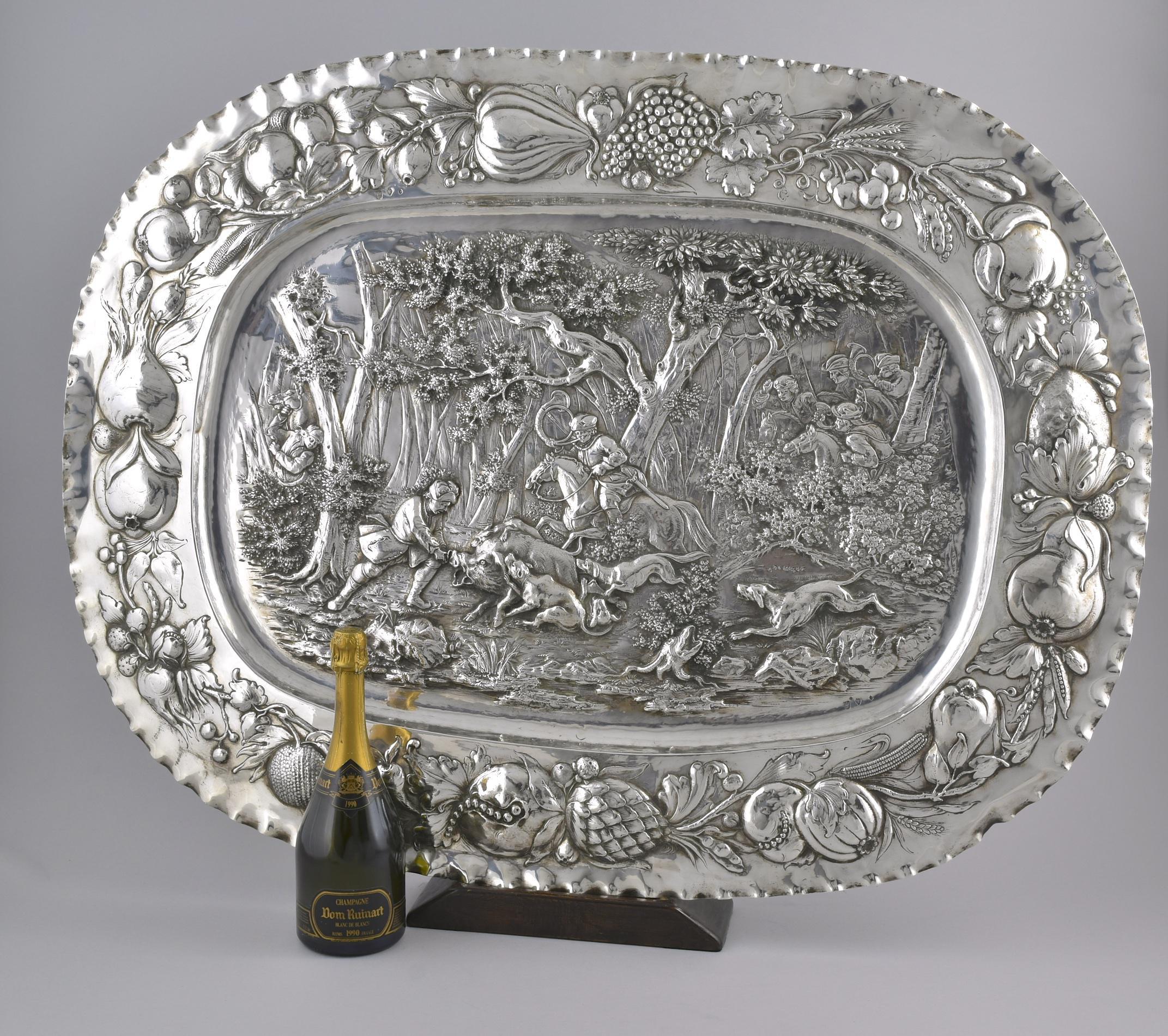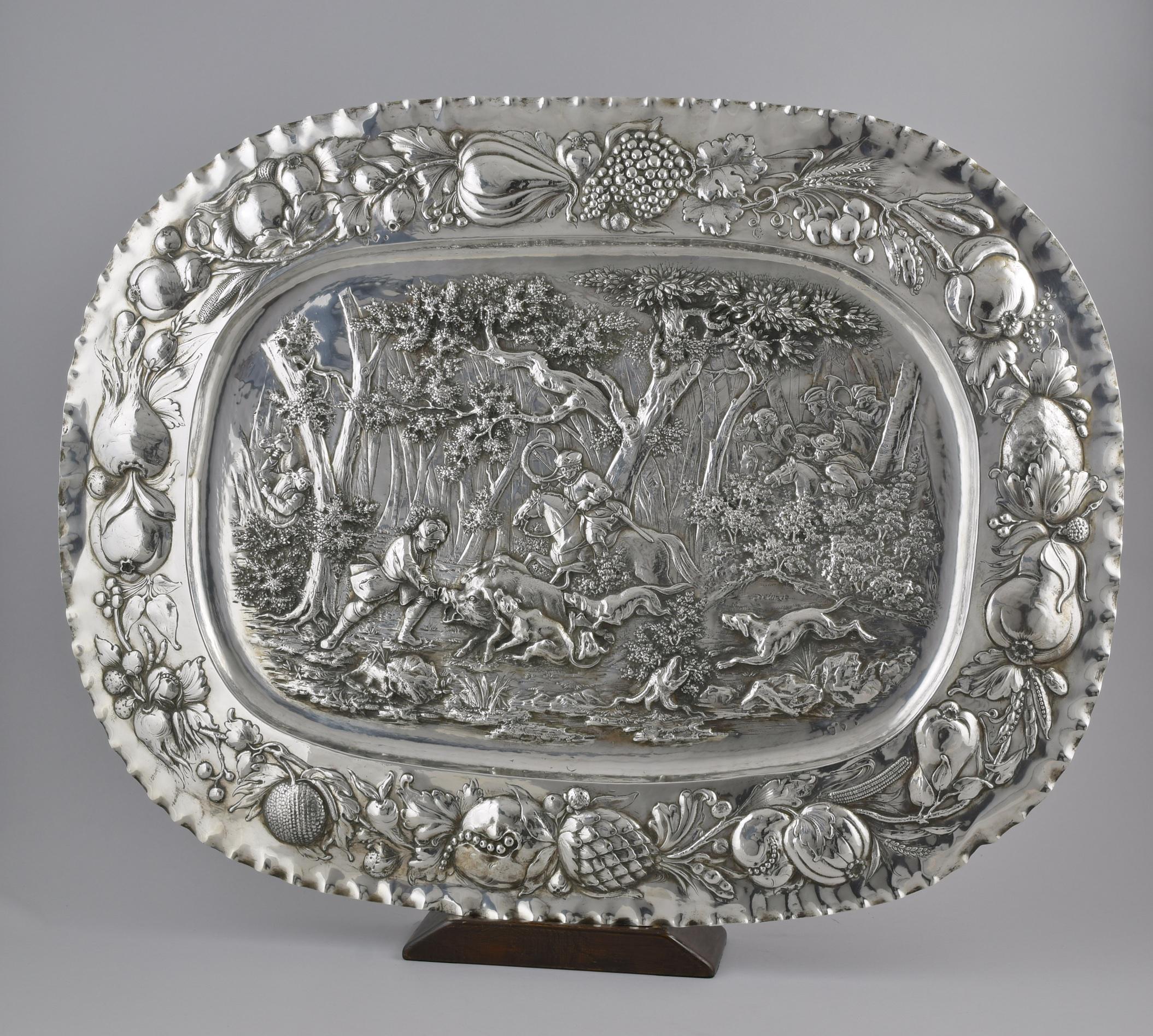 repoussé and chased with fruit and foliage, the centre with a hunting scene.