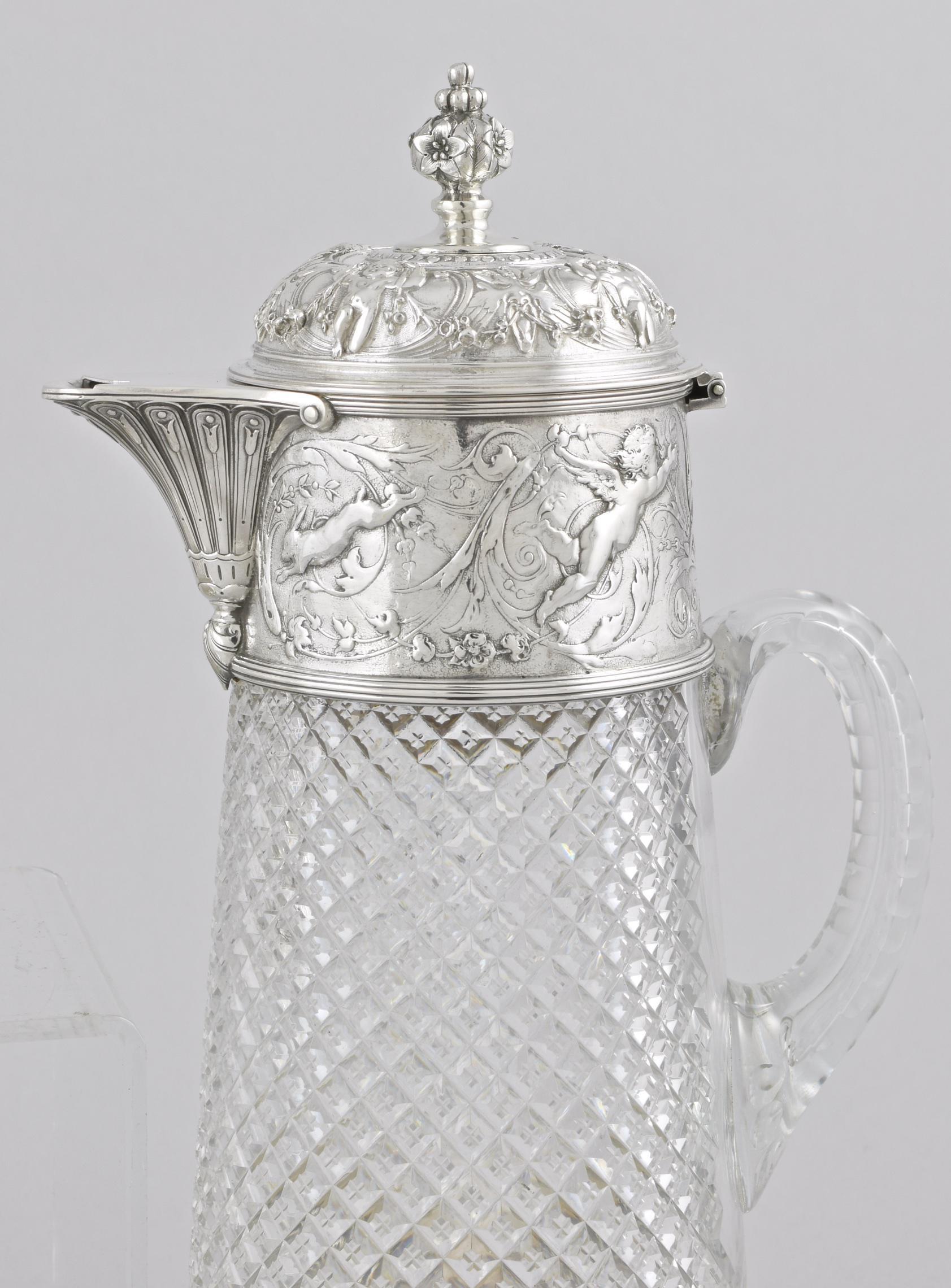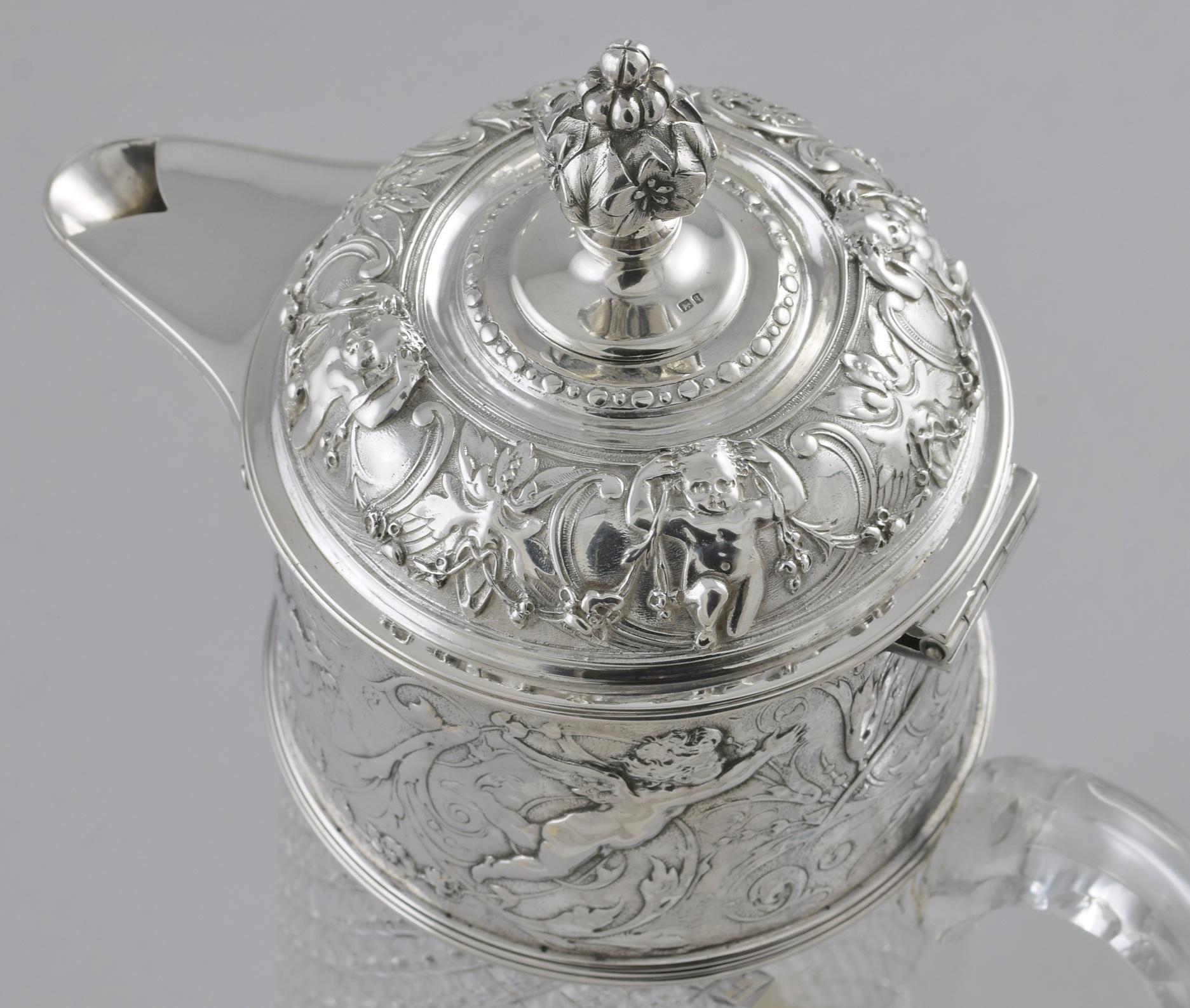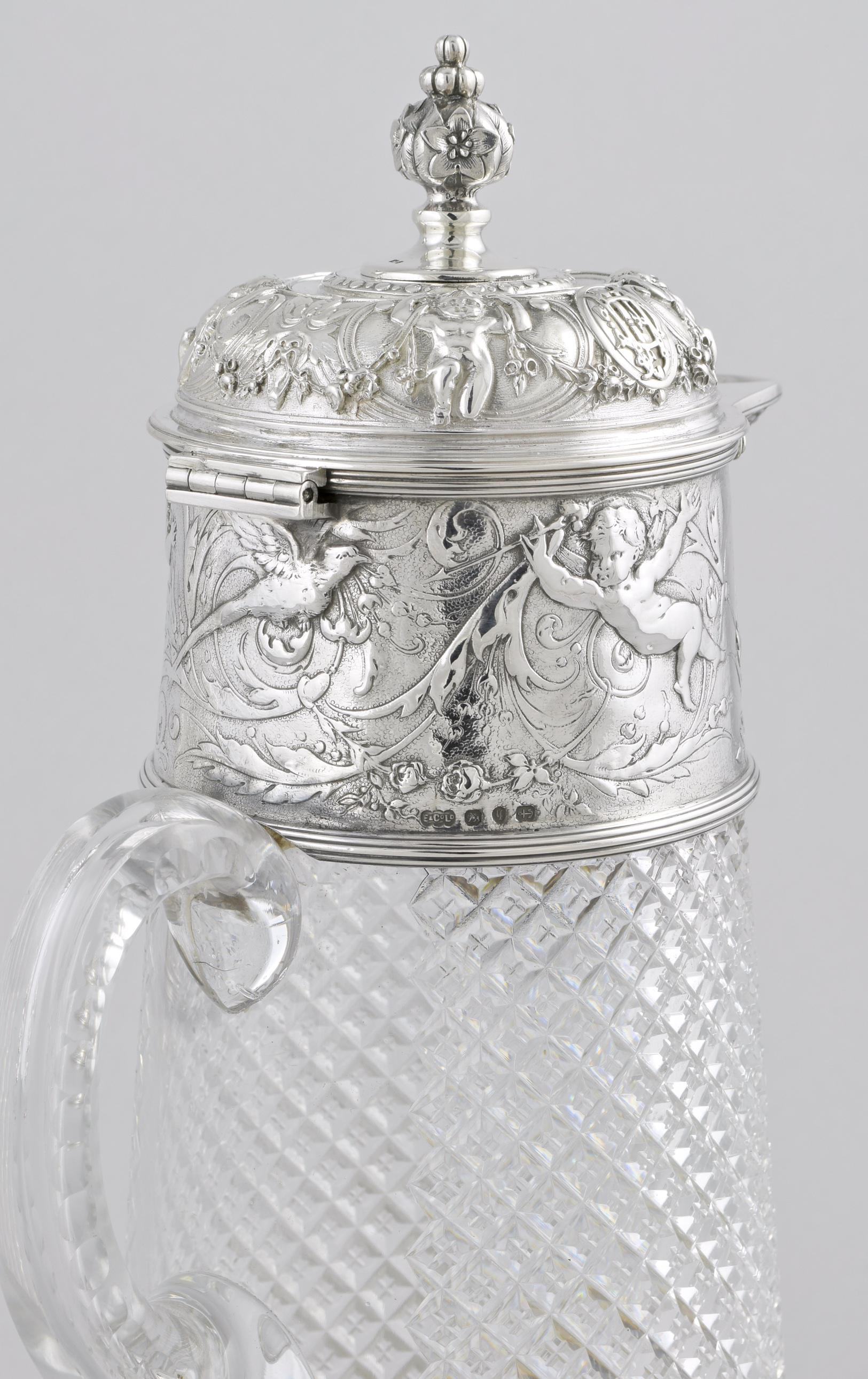 - A large Pair of Victorian silver mounted wine jugs
