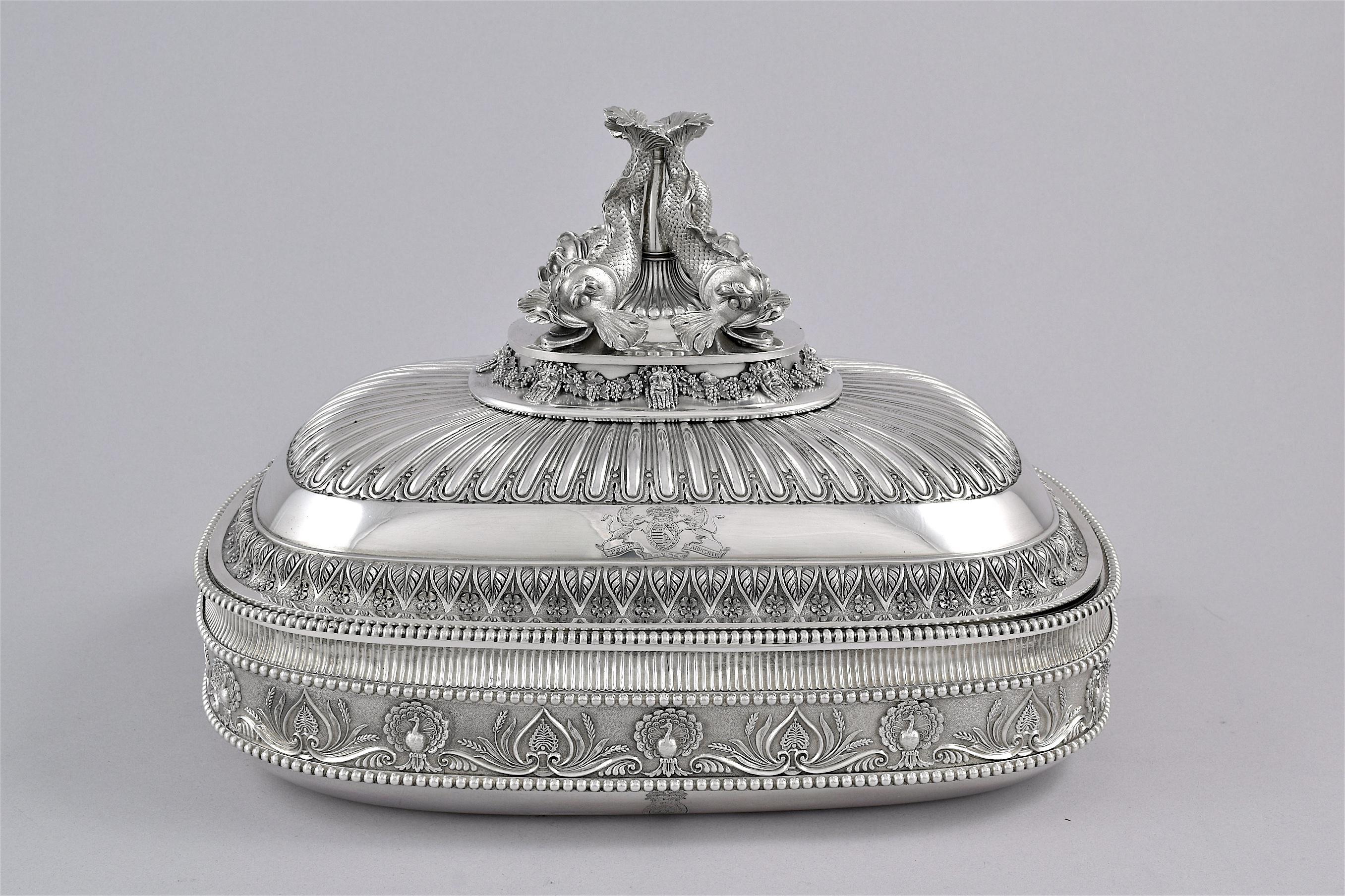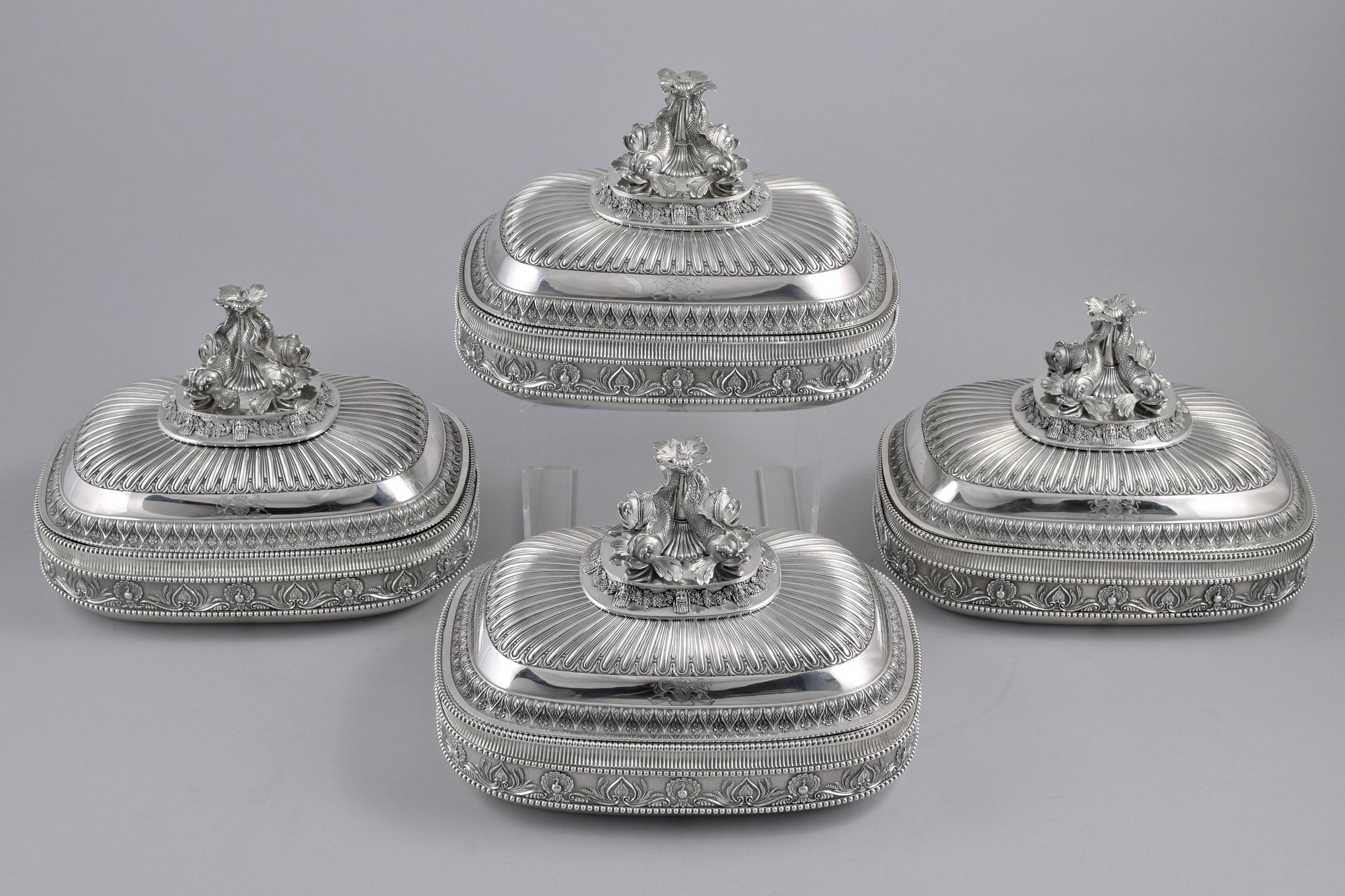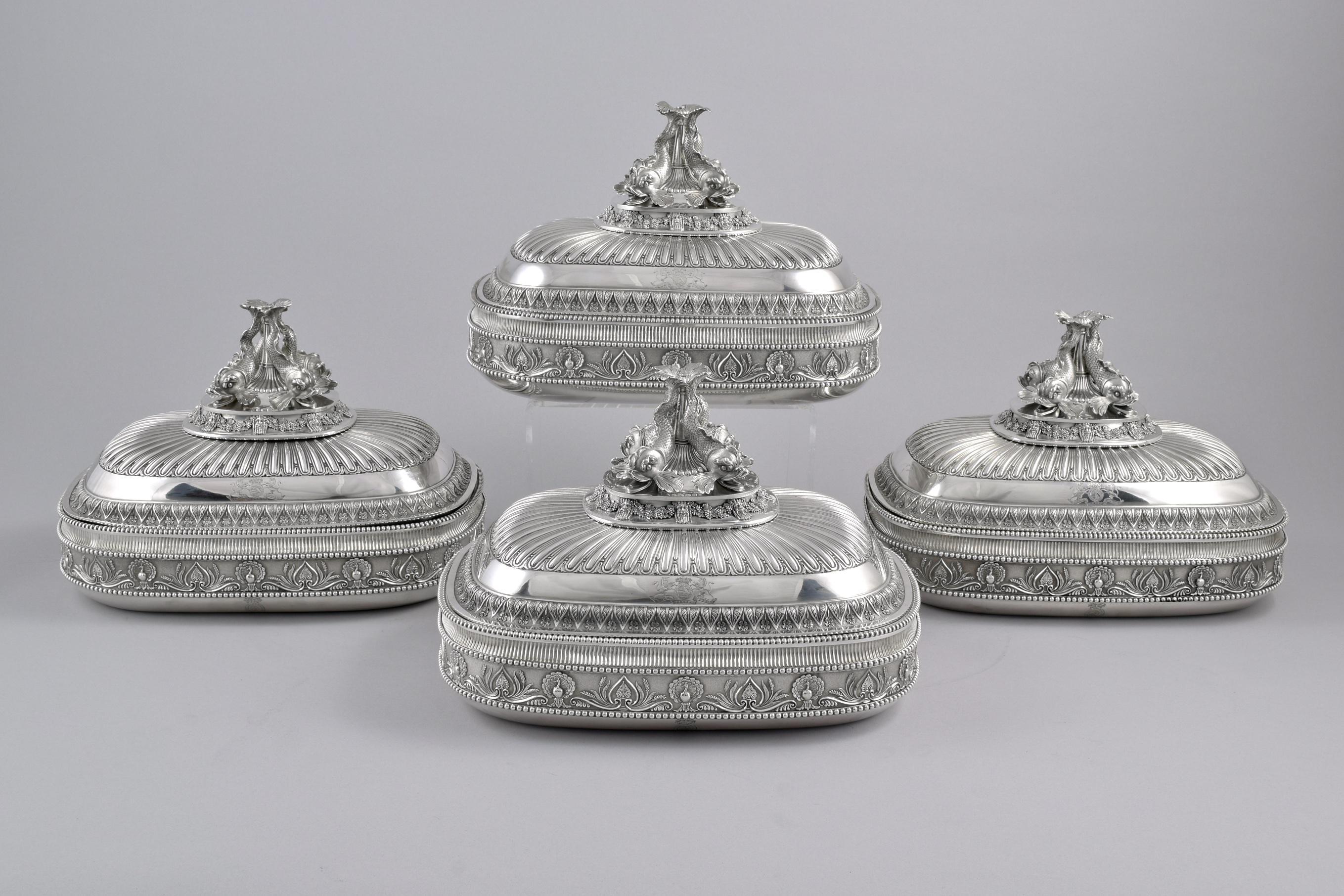 Of rounded rectangular form, the bases with an outer frieze of peacocks and anthemia, the covers with a band of palmettes and flowers The finials are each formed as four dolphins above cast relief band of grapevine swags between Greek masks. The dishes with beaded rims, each cover engraved twice with arms, the dishes and bases engraved twice with crests within garter motto and below a ducal coronet, numbered 1-4