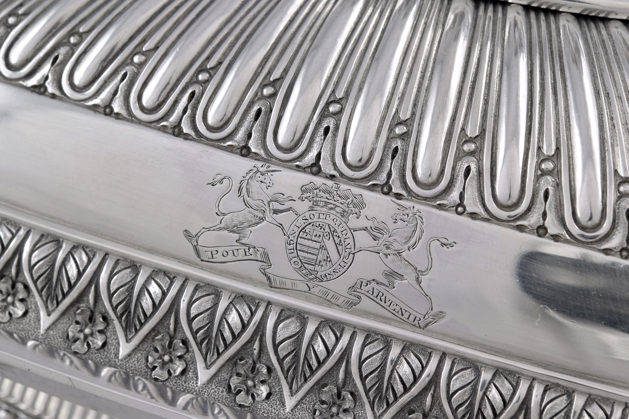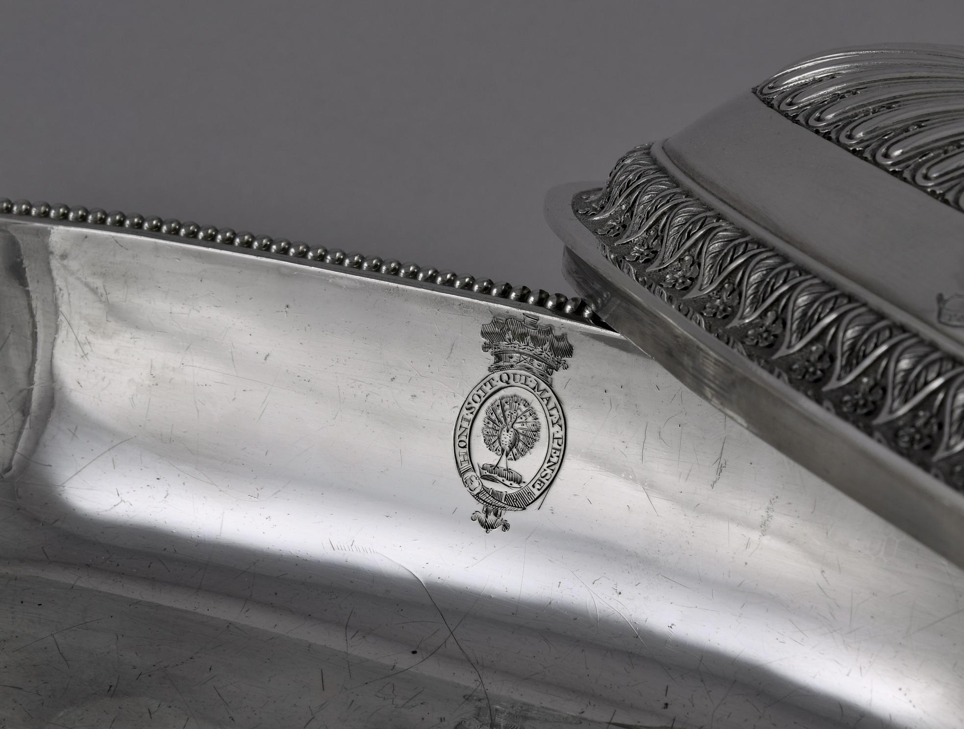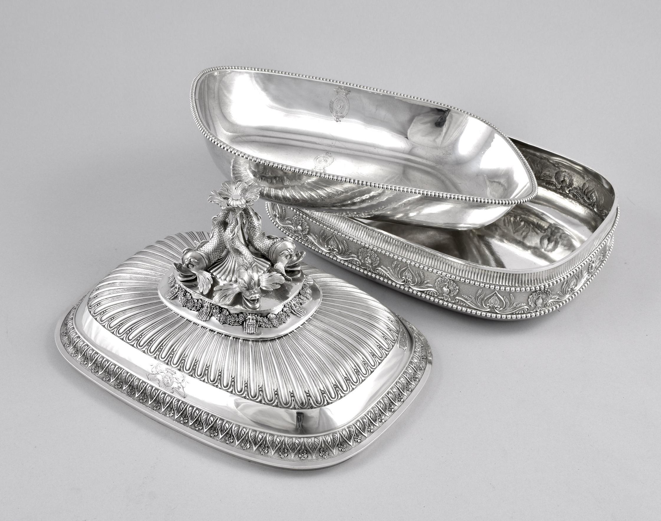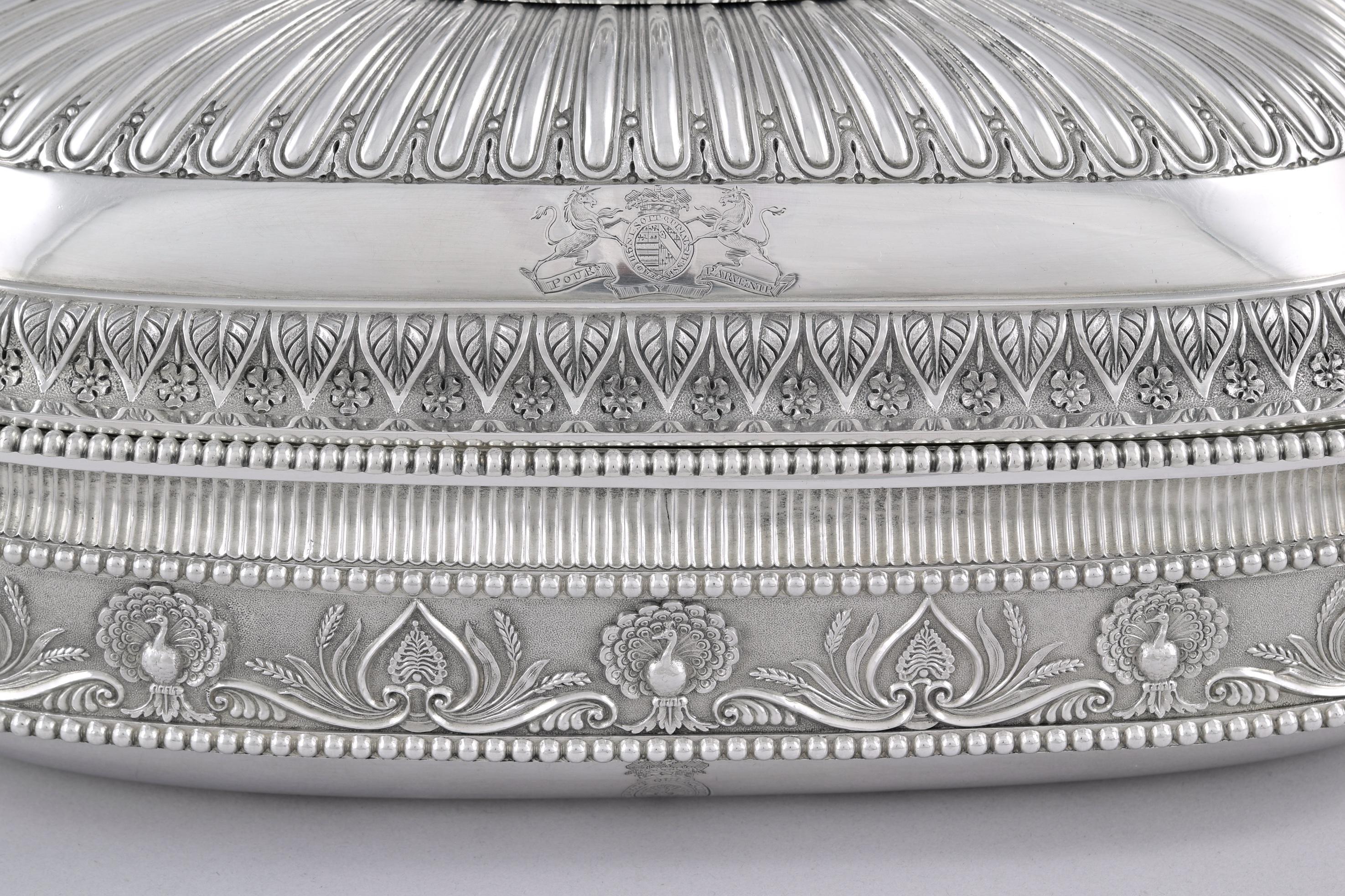 Of rounded rectangular form, the bases with an outer frieze of peacocks and anthemia, the covers with a band of palmettes and flowers The finials are each formed as four dolphins above cast relief band of grapevine swags between Greek masks. The dishes with beaded rims, each cover engraved twice with arms, the dishes and bases engraved twice with crests within garter motto and below a ducal coronet, numbered 1-4