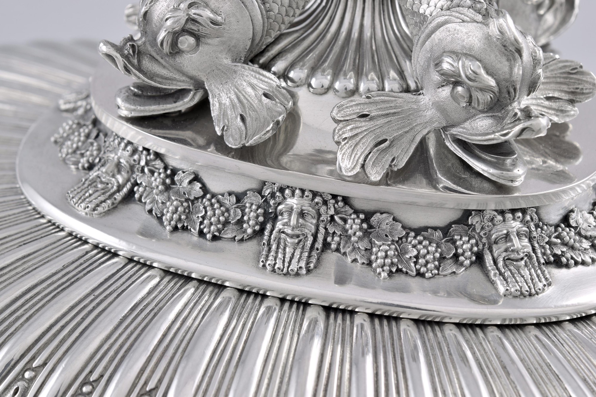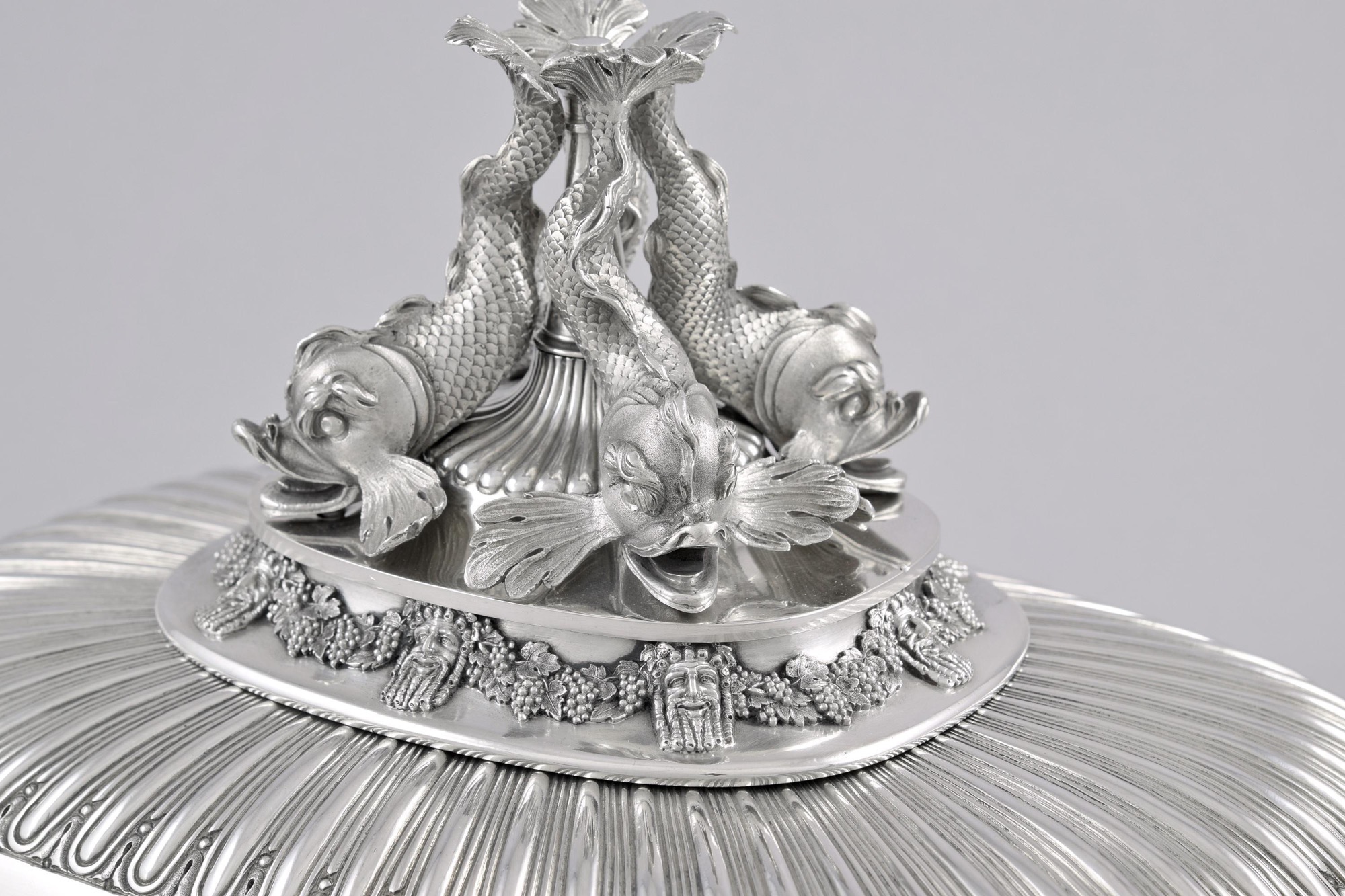 Luckily the Marine Service survived the devastating 1816 fire which gutted Belvoir Castle; the Duchess oversaw its redecoration into a Regency showplace, and precursor of George IV's remodeling of Windsor Castle (Belvoir stood in for Windsor in the television series The Crown). She also advised her intimate friend Frederick Augustus, Duke of York, younger brother of the Prince Regent, on the design of his new London townhouse. The Duke of York was one of the great silver patrons of his era, probably second only to his brother the Prince Regent, and the sculptural, revivalist style he preferred for his silver may have been influenced by the Rutlands' collection of plate.
