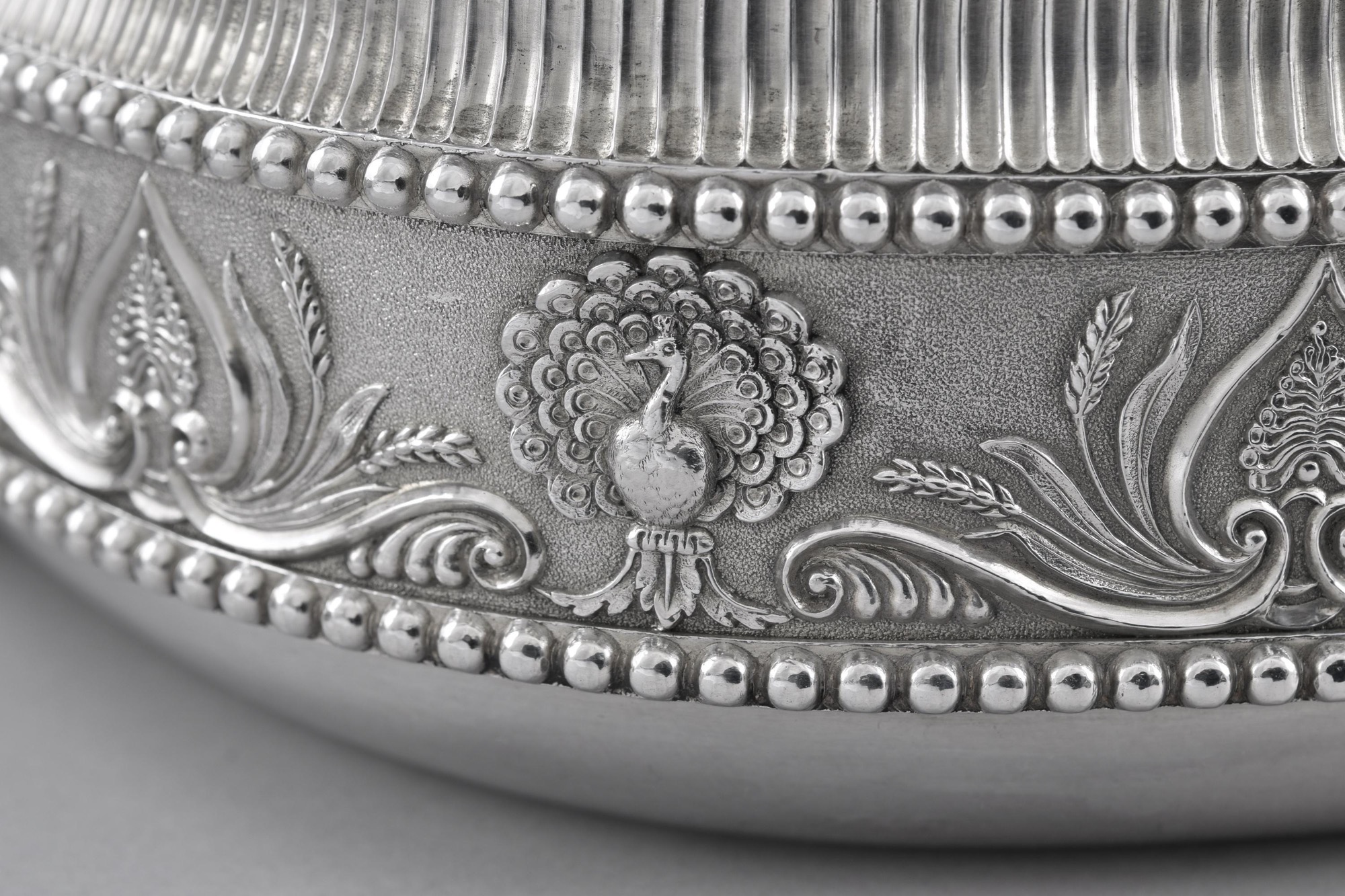 The 4th Duke died in 1787 and was succeeded by his 9-year-old son, John Henry, who became 5th Duke. In 1799 he married Elizabeth Howard, who had grown up in the cultured environment of Castle Howard, Yorkshire. A patron and connoisseur in her own right, she seems to have taken up the mantle of enhancing the family houses that was begun by her father-in-law. As part of their refurbishments, the Royal Goldsmiths Rundell, Bridge and Rundell raised the 1780 centrepiece on a tall plateau of sea horses and extended the service with twelve entrée dishes - four each of rectangular, square, and circular shapes - by Benjamin Smith II. The dolphins of their finials echo those on the 1780 centerpiece and sauce boats, while the peacocks of the frieze are the Manners family crest. When fully laid out on the table, the watery reflections of the white silver must have looked spectacular by candlelight.